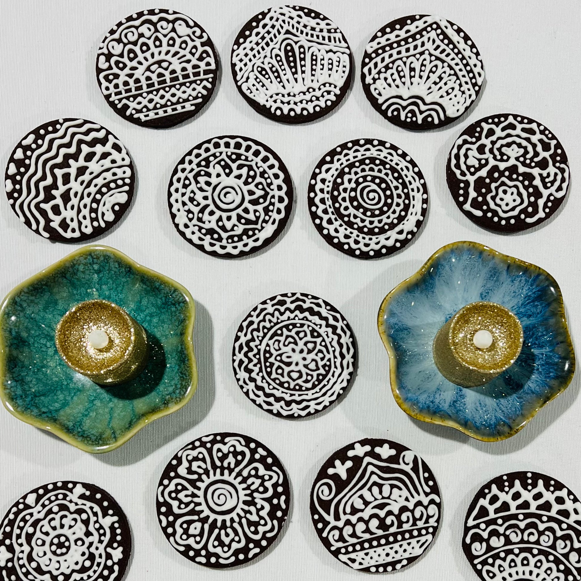 Delicately spiced chocolate cardamom sugar cookies, hand-decorated with intricate mehndi-inspired royal icing. These cookies combine rich flavor with timeless artistry — perfect for Diwali celebrations, weddings, or elegant gifting.