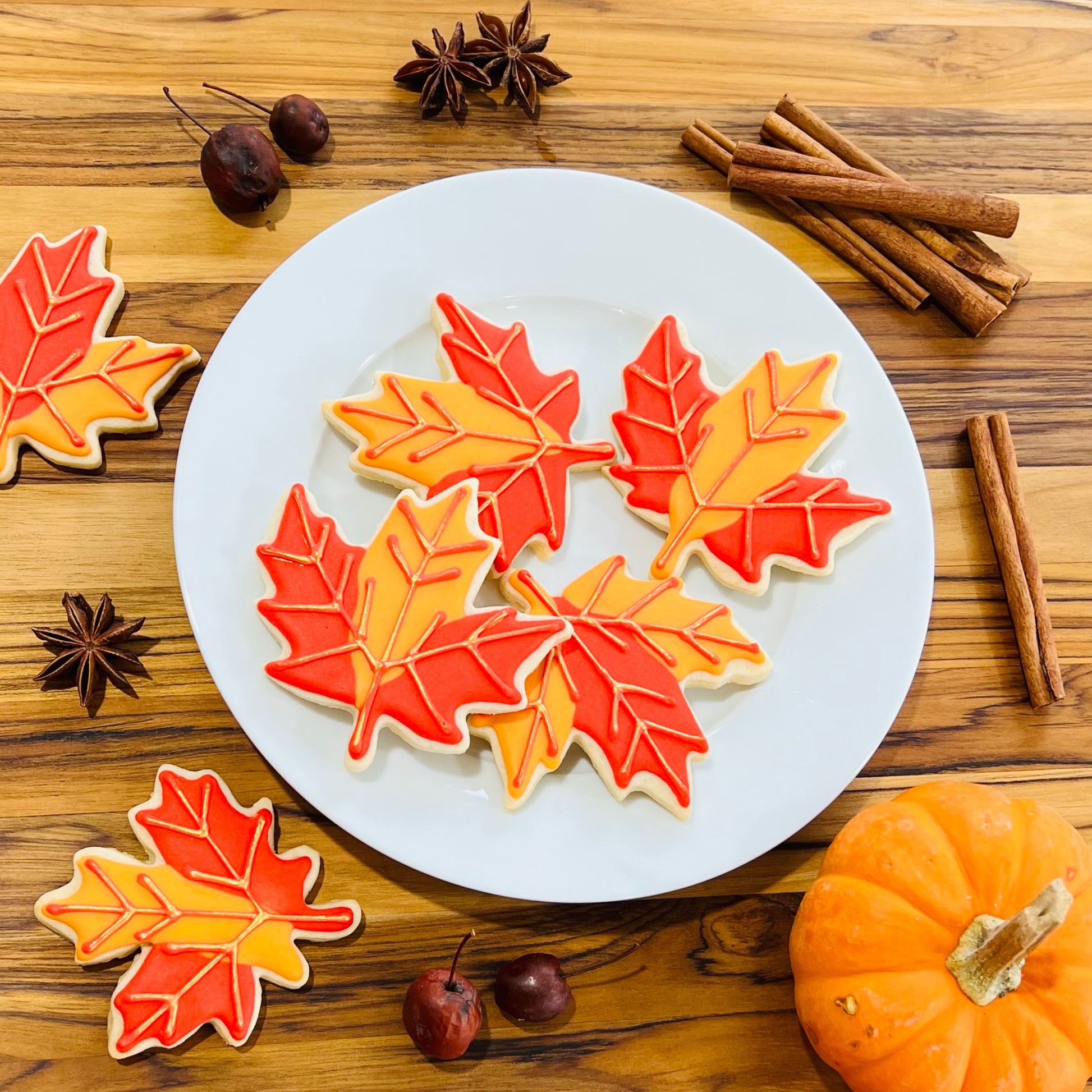 Each cookie is baked fresh with buttery vanilla dough and finished with smooth royal icing — available in your choice of Classic Vanilla or Maple-Flavored Icing. Every leaf is individually detailed in autumn tones and brushed with edible gold for a refined, seasonal look.
